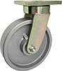 Koła i zestawy kołowe żeliwne do dużych obciążeń w obudowie skrętnej firmy ZABI składają się z koła o jednolitym, obrabianym maszynowo korpusie z odlewu żeliwnego oraz ze stabilnej stalowej obudowy spawanej. Koło występujące w tej obudowie osadzone jest na tulejce, montowane jest z kielichem obudowy za pomocą śruby i nakrętki. Precyzyjne wykonanie obudowy skrętnej z płytką mocującą umożliwia obracanie zestawu skrętnego w pionie oraz dowolne manewry maszynami, środkami transportowymi itd. Specjalna budowa pozwala na łatwe skręcanie zestawem bez dodatkowych sił i środków pomocniczych oraz zachowanie stabilnego kierunku ruchu w linii prostej. Zestaw kołowy w obudowie skrętnej z płytką mocującą posiada konstrukcję z blachy spawanej, co wpływa na jego wytrzymałość. Koła występują z łożyskiem kulkowym. Łożysko kulkowe osadzone jest w piaście żeliwnej koła z tuleją dystansową.