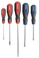 Końcówka grota magnetyczna. Rękojeść dwuskładnikowa z twardego i miękkiego antypoślizgowego tworzywa. Skład zestawu :- wkrętaki płaskie 3.2x75, 5x100, 6x150 mm.- wkrętaki krzyżowe (PH): 1x75, 2x100 mm.